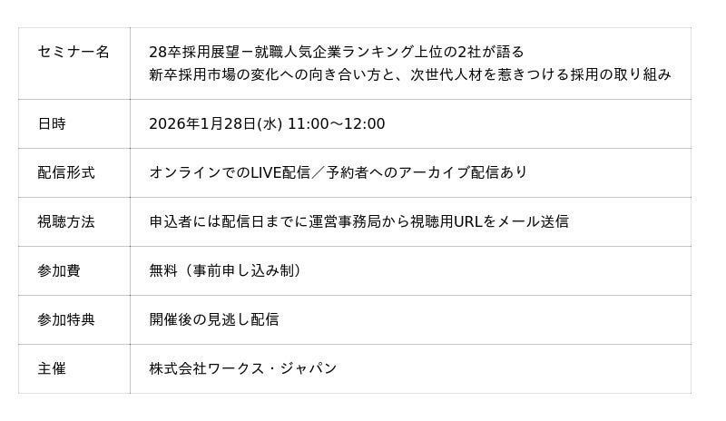 株式会社ワークス・ジャパン(本社:東京都千代田区、代表取締役:清水信一郎)は、2026年1月28日(水)に、企業の人事・人材開発担当者や人事責任者を対象にしたオンラインフォーラム、WORKS REVIEW『28卒採用展望-就職人気企業ランキング上位の2社が語る新卒採用市場の変化への向き合い方と、次世代人材を惹きつける採用の取り組み』を開催します。