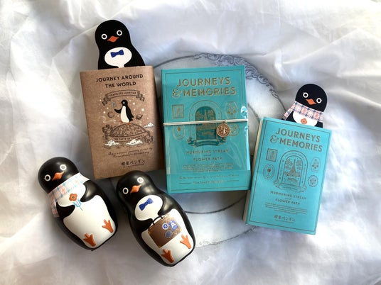 『喫茶ペンギン』で人気のブック型ボックスアソート「旅とダイアリー」シリーズや、“ペンギン”をかたどった缶商品が、そのままブックカバーとしおりになって登場します。贈り物にも、ご自分用にもぴったり。