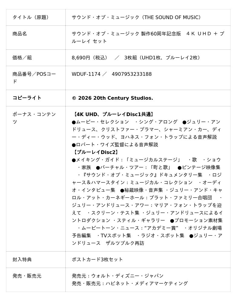 『サウンド・オブ・ミュージック』は、モーツァルト生誕の地、世界的に名高い音楽祭の開催地としても知られる美しいアルプスの街オーストリア・ザルツブルクを舞台に、歌を愛する修道女見習いのマリアが、歌うことを禁じられたトラップ一家の子供たちの家庭教師となり、歌を通して家族の絆を深めていく物語。この度発売するのは、ディズニーの修復チームが総力を挙げて挑んだ史上最高の映像とサウンドが収録された<製作60周年記念版>で、マリアが歌い継ぐ「ドレミの歌」、「私のお気に入り」、「エーデルワイス」などの永遠の名曲を、迫力のドルビーアトモスで楽しむことができます。さらに、オリジナル版に加え、日本語吹替版3種の<シング・アロング>も収めた永久保存版です!数々の傑作ミュージカルを生んだ天才作詞・作曲家コンビ、リチャード・ロジャース&オスカー・ハマースタインの記念すべき最後の作品でもあり、世代を問わず何度でも観て歌って楽しめる、まさに永遠の名作が最高のクオリティで登場します!