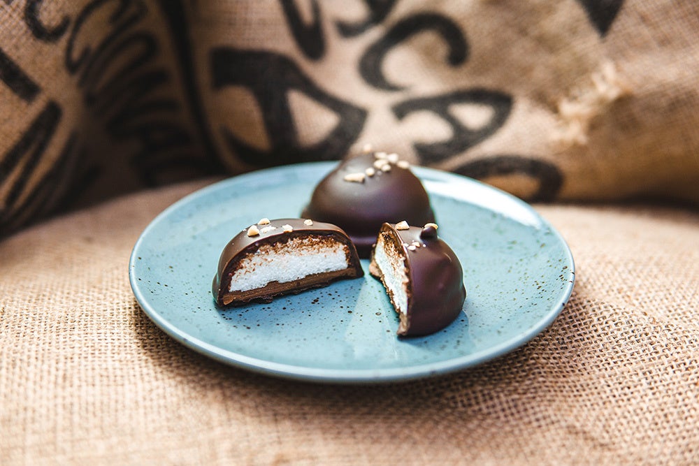 ◆ネネプラリネやジャンドゥーヤをベースにマダガスカル産バニラが香るギモーヴのムースを載せてダークショコラでコーティングしました。泡のように柔らかく、繊細で優しい甘さと香りが広がります。