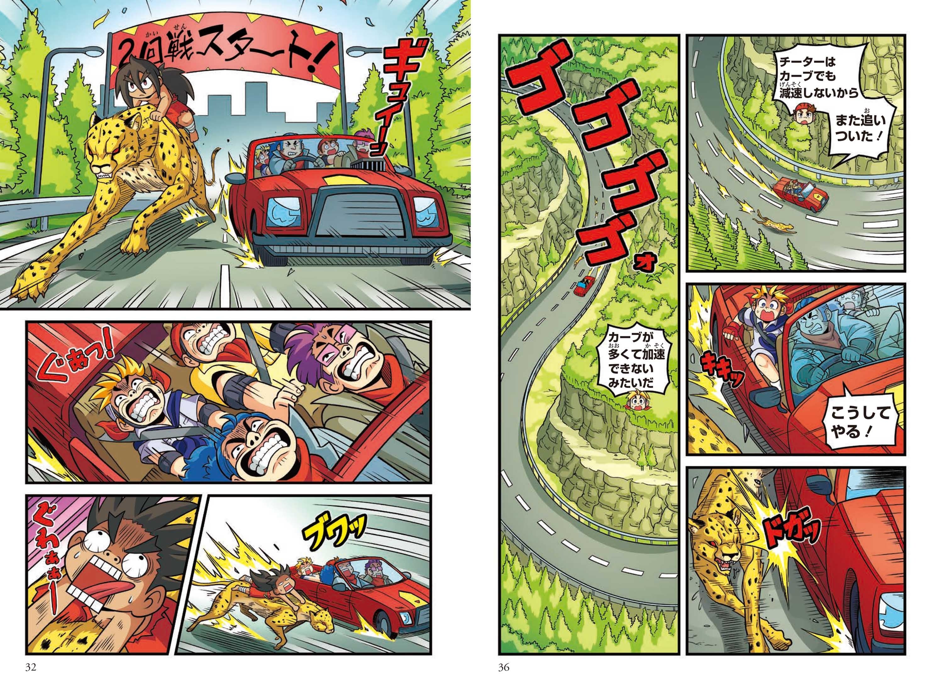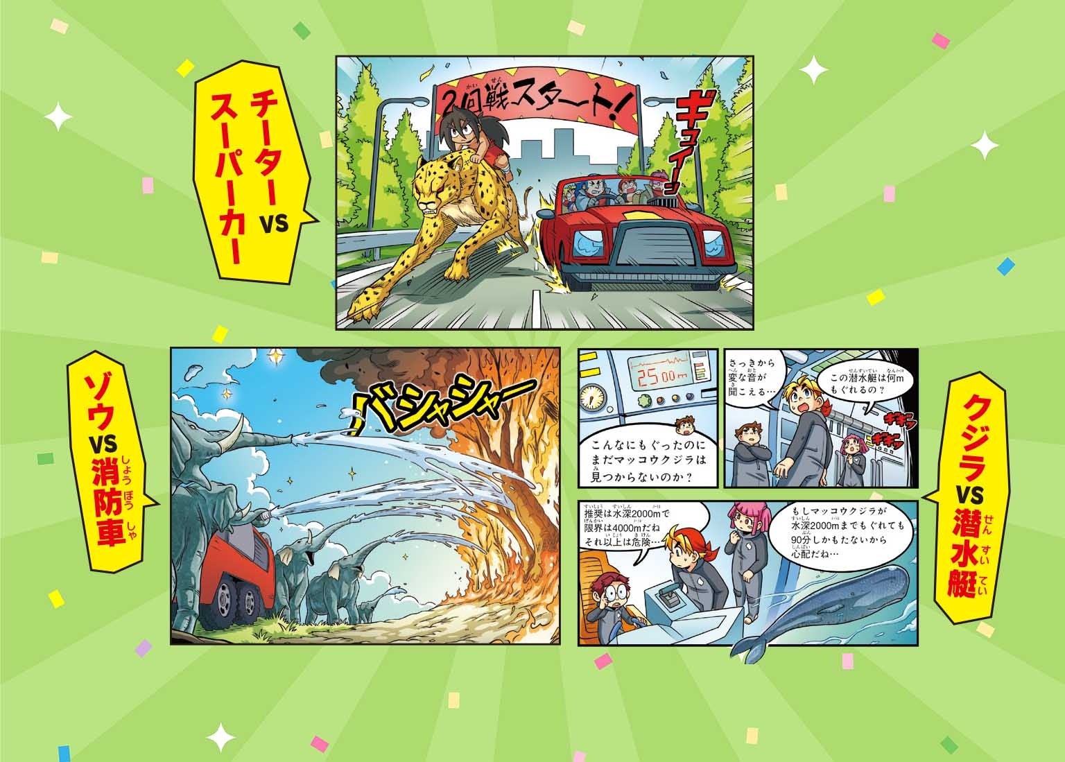 今回のバトルは、いつもと趣向を変えた「動物vsのりもの」対決。まんがを通して、だれもが一度は思ったことがある「チーターとスーパーカーはどっちが速いのだろう?」といった疑問について、シリーズおなじみのXベンチャー調査隊のジェイクたちが楽しく調査していく内容となっています。