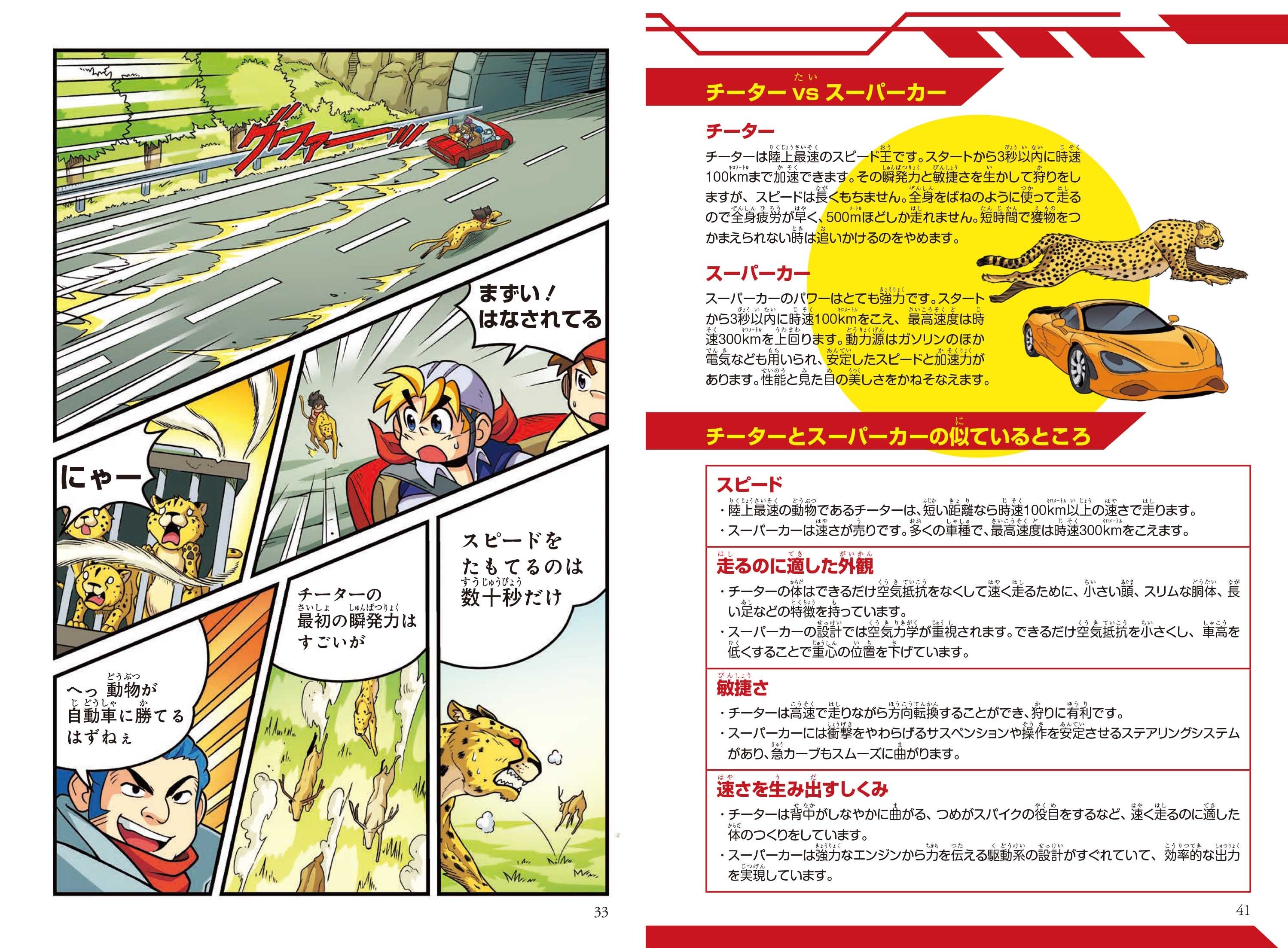 本書は、単に動物とのりものを比べて「お互い似ている部分があって、同じような行動をするよね」だけで終わるものではありません。たとえば「チーターvsスーパーカー」では、「なぜチーターは速く走れるのか?」「カーブが多い道をスムーズに走れるのはどっち?」といった疑問の解説をまんがの中に盛り込みつつ、記事ページでもお互いの生態・性能を解説しています。
