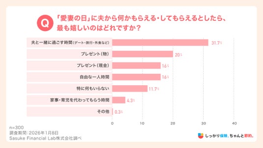 Sasuke Financial Lab株式会社(本社:東京都千代田区、代表取締役:松井 清隆)が運営する、保険比較・FPに無料相談できる総合保険サイト「しっかり保険、ちゃんと節約。(https://www.navinavi-hoken.com/)」において、1月31日の「愛妻の日」を前に、夫からの贈り物について、20代以上の既婚女性300名を対象に意識調査を実施し、公開しました。
