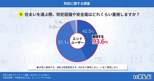 エンドユーザーに「住まいを選ぶ際、防犯設備や安全面はどのくらい重視しますか?」という質問をしたところ、「非常に重視する」(42.5%)、「ある程度重視する」(51.1%)、「あまり重視しない」(5.0%)、「全く重視しない」(1.4%)という結果となりました。