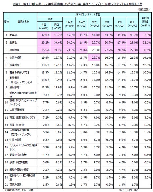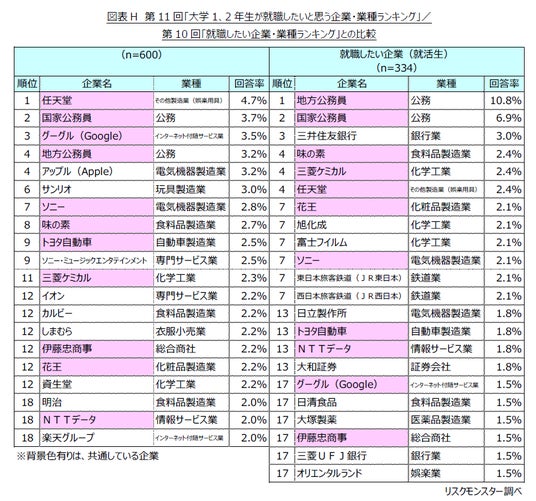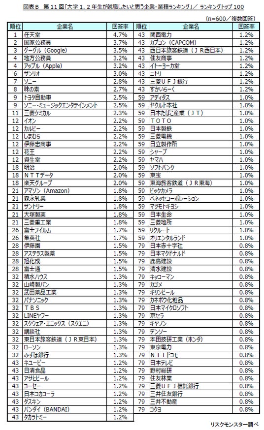 ・調査名称 : 第11回「大学1、2年生が就職したいと思う企業・業種ランキング」調査・調査方法 : インターネット調査