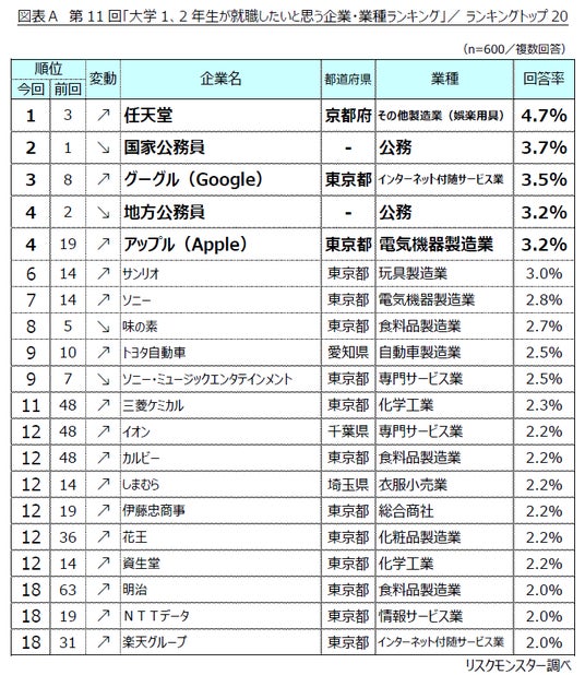 過去10回の調査のうち、8回で公務員がトップ2を占めていましたが、今回の調査では「任天堂」が2回ぶりに1位となったほか、前回8位の「Google」が3位にランクインしたことで、「地方公務員」はトップ3から陥落しました。