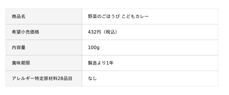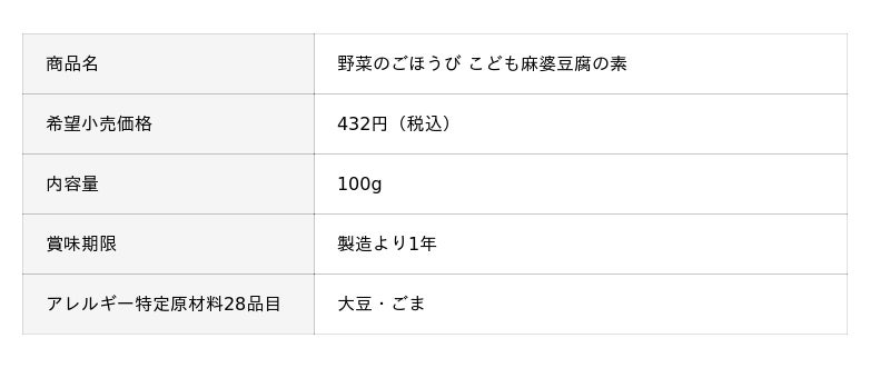 そこで当社は、アレルギーを持つ子どもはもちろん、家族みんなが一緒に美味く食べられることを目指し、動物性食材を使用せず、厳選した原材料で美味しさを追求したレトルト食品『野菜のごほうび こどもシリーズ(麻婆豆腐の素・カレー)』を開発しました。