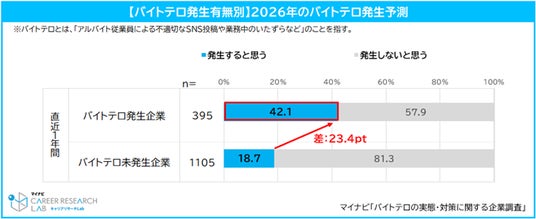 また、2025年に「バイトテロ」が発生したと回答した企業に、2026年も発生すると思うかを聞いたところ、「発生すると思う」と答えた割合は42.1%となり、未発生の企業(18.7%)よりも23.4pt高く、直近1年以内で「バイトテロ」が発生した企業ほど発生リスクの現実性を強く認識し、再発可能性を高く見積もる傾向にある。