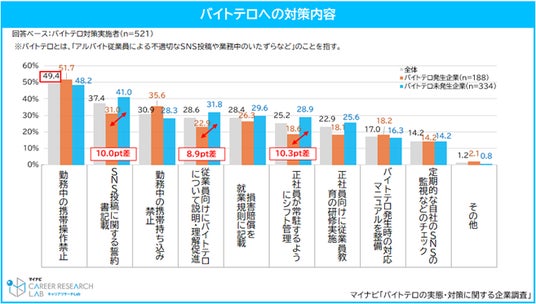 実施されている「バイトテロ」対策では、「勤務中の携帯操作禁止」が49.4%でもっとも高く、「SNS投稿に関する契約書記載(37.4%)」「勤務中の携帯持ち込み禁止(30.9%)」が続いた。