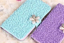 閉じたままでも通話ができる便利な穴つきケース。ストラップのフラワービジューが目を引きます。