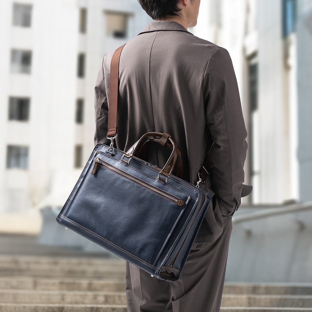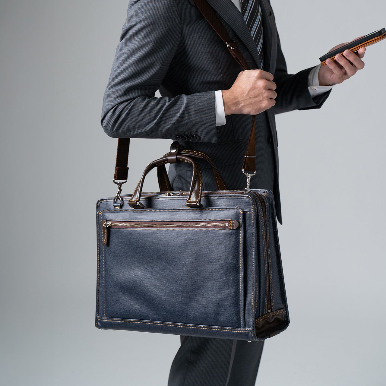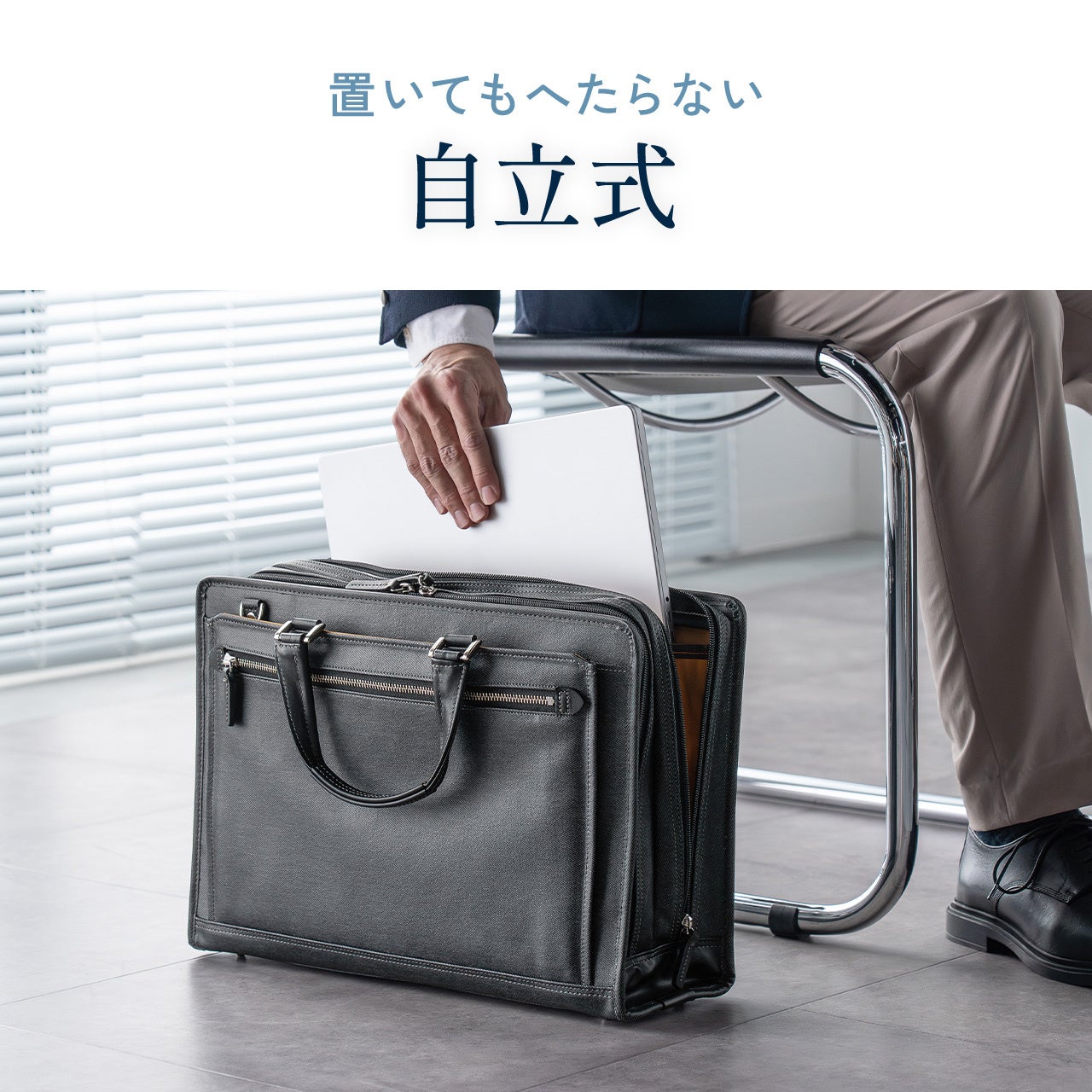 表面生地は防水加工済み。天候が読めない日でも気兼ねなく持ち歩けます。さらに、置いてもへたらない自立式だから、商談先やデスク脇でも“きちんと感”をキープ。床に置いた瞬間のだらしなさを回避し、立ち姿までスマートに見せてくれるのが嬉しいポイントです。
