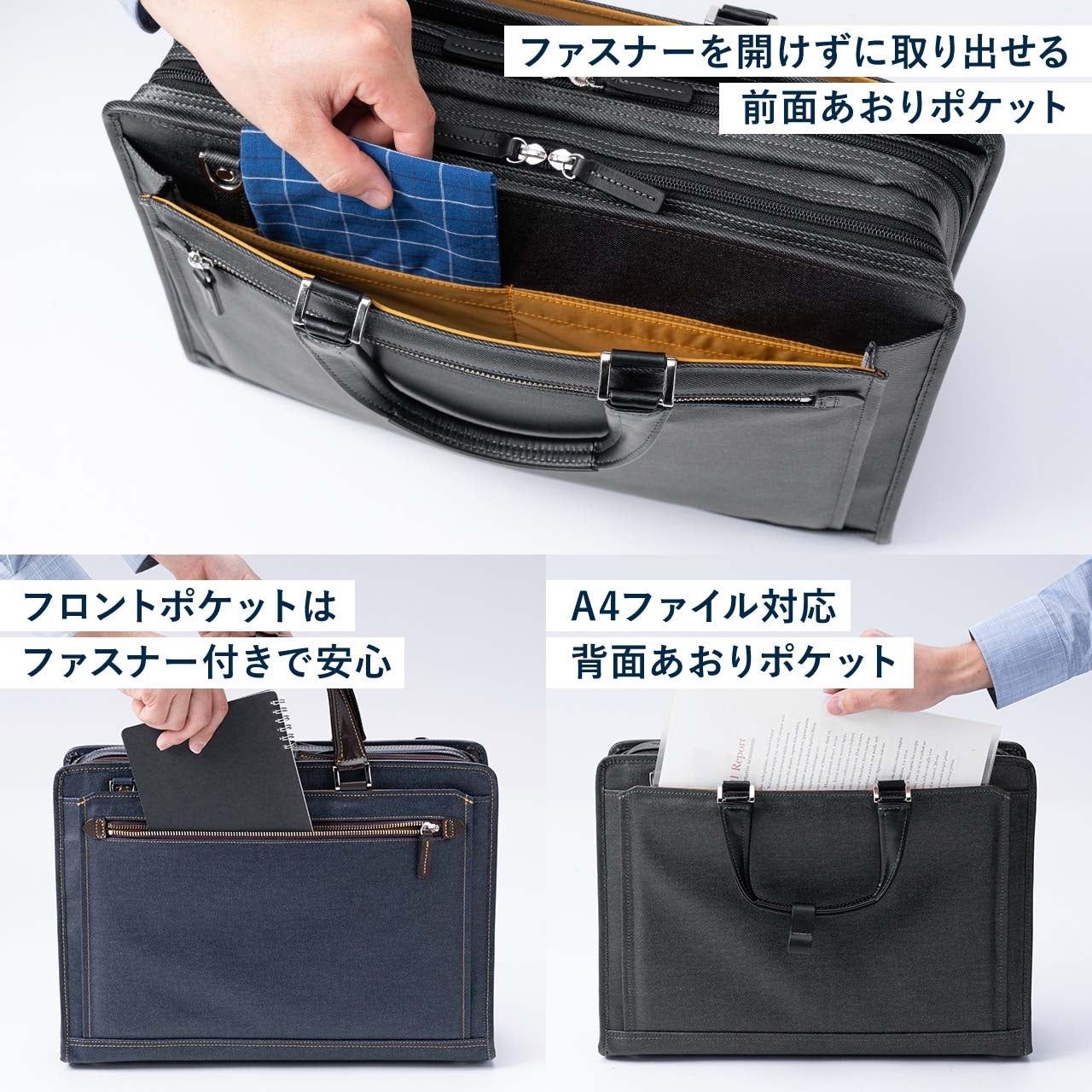 2つの大きなメインルームで収納力は抜群。A4書類はもちろん、必要なアイテムをまとめて整理できます。さらに三方ファスナー仕様で開口部が大きく開き、上開きタイプに比べて中身が見やすく取り出しやすいのも特長。移動中でも欲しいものにすぐ手が届き、商談前の準備やデスク脇での出し入れもスマートにこなせます。