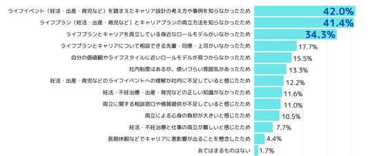 退職・転職を検討した理由として最も多かった回答は「ライフイベント(妊活・出産・育児など)を踏まえたキャリア設計の考え方や事例を知らなかったため(42.0%)」でした。次いで「ライフイベント(妊活・出産・育児など)とキャリアプランの両立方法を知らなかったため(41.4%)」、「ライフイベントとキャリアを両立している身近なロールモデルがいなかったため(34.3%)」と続きました。