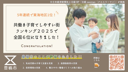 日本経済新聞社と日経BPの情報サイト『日経 xwoman(クロスウーマン)』による「共働き子育てしやすい街ランキング 2025」総合編で、愛知県豊橋市が6位に選ばれました!
