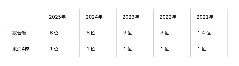 4年連続全国トップテン入りです!愛知・岐阜・三重・静岡の東海地方では、2021年より5年連続の1位に輝いています!