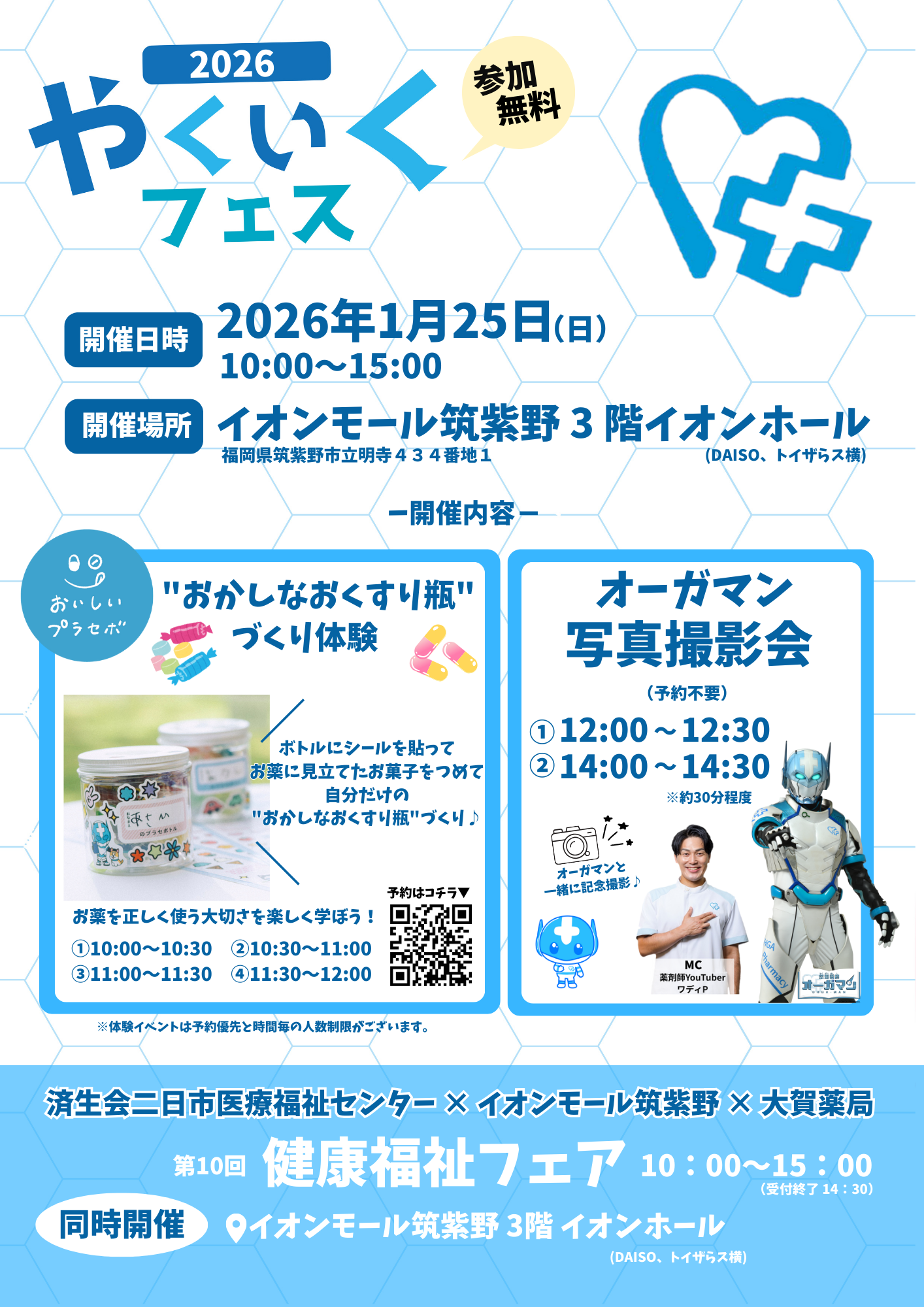 大賀薬局やくいくフェス・・・おかしなおくすり瓶づくり体験(予約制)、オーガマン写真撮影会