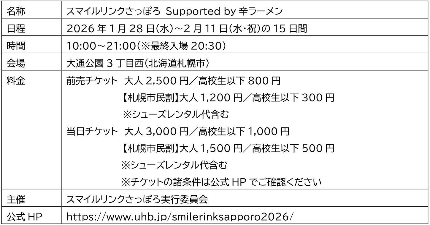 「笑う冬には、福来たる。」をキャッチフレーズに開催する「スマイルリンクさっぽろ Supported by辛ラーメン」は、札幌市の観光推進施策として、今年も開催されます。会場は前年に引き続き、大通公園3丁目西で、さっぽろ雪まつりの連携事業として実施されます。開催期間中、国内外からの観光客や市民の方に、札幌の新たな夜観光アクティビティとして、アイススケートをお楽しみいただけます。アクティオは、この「スマイルリンクさっぽろSupported by辛ラーメン」のスポンサーとして、本イベントを盛り上げていきますので、是非ご期待ください。