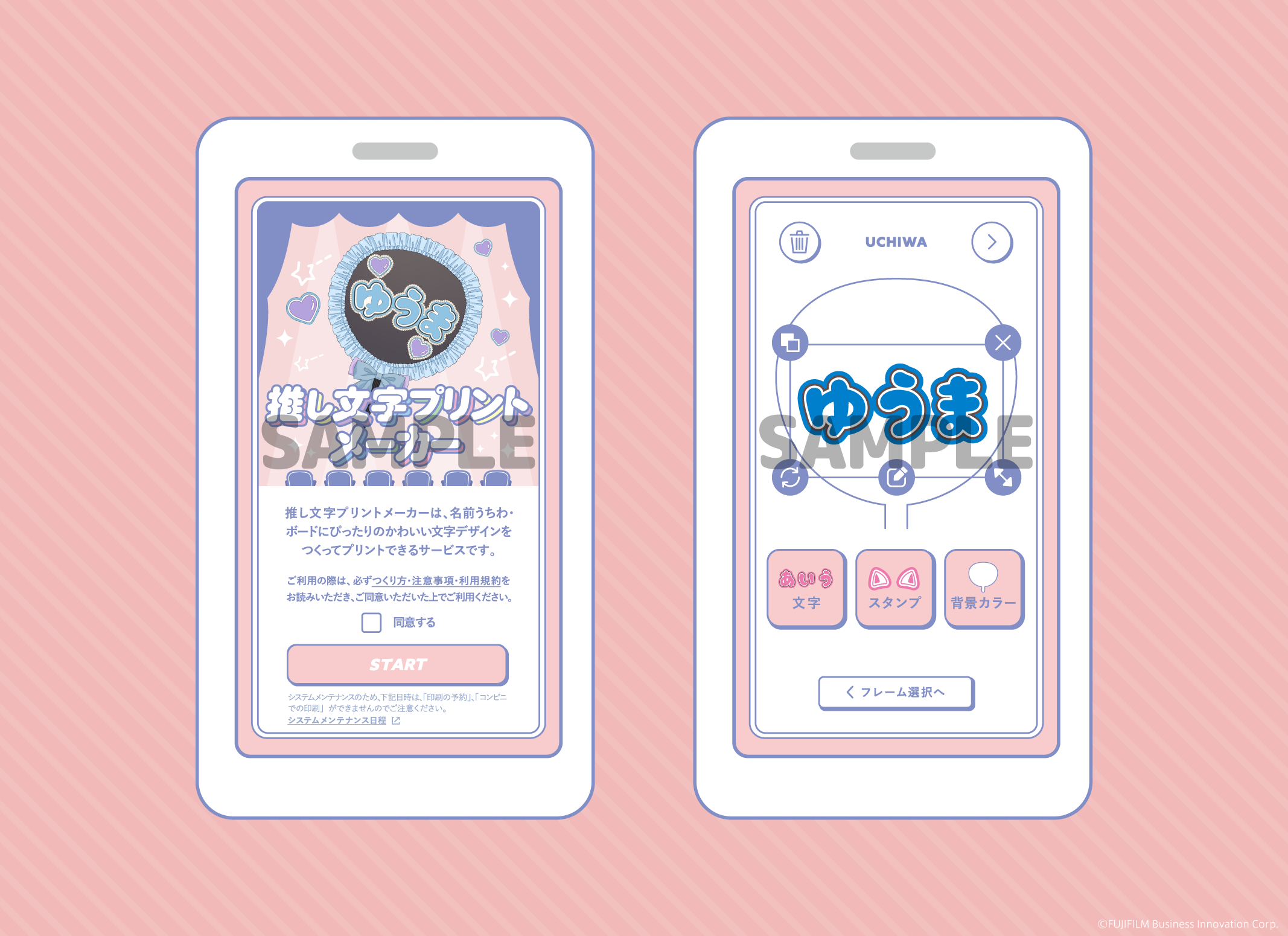 本ウェブサイトは、「ピースして」「バーンして」などのかわいらしいテンプレートから選んでコンサート直前でも手軽に応援準備ができる「推し文字プリント」をもとに開発したウェブサービスです。推しの名前やクラス名、応援メッセージなど、お好みの文字を自由に入力してデザインすることができ、より自由度の高い“推し活”アイテム作りをお楽しみいただけます。作成したデザインは、本ウェブサイト上から「ネットプリント」に登録でき、セブン‐イレブン店内のマルチコピー機でスムーズにプリントしていただけます。