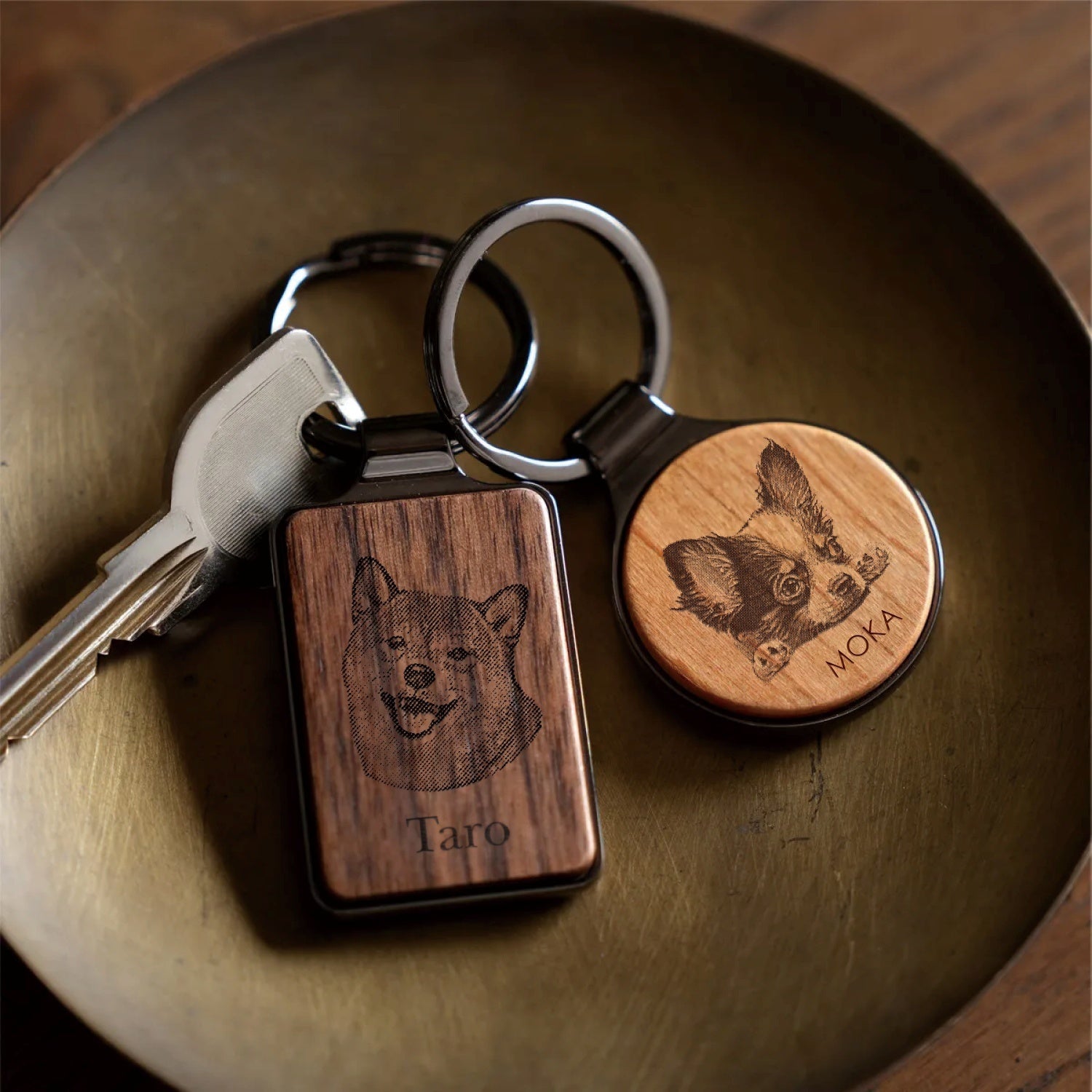 銘木を使用した木製雑貨にかわいいワンちゃんを刻印することができます。キーリングほか、店内商品に刻印が可能です。