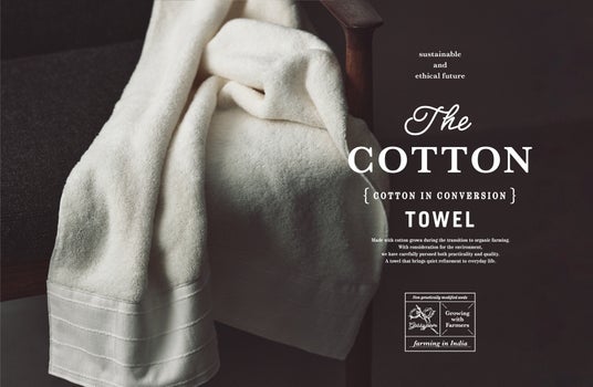 今回発売するのは、農薬や化学肥料を大量に使う従来の農法からオーガニック農法へと移行するまでの、3年間に栽培されたコットン(コットン・イン・コンバージョン)を使用したフェイスタオルとバスタオルの2種類です。ホテルライクなデザインに仕立て、ボリューム感と上質でリッチな使い心地を追求した製品で、農薬や化学肥料に使わずに育てられたコットンを使用しているだけでなく、ふんわりとした柔らかさと高い吸水性を有しています。サステナビリティと実用性、そのどちらも大切にしたタオルです。