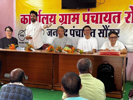 (左)アクタスでは2024年にインドの綿花農家を視察。(右)視察時には綿花農家の方々へヒアリングを行う。写真右から2番目がアクタス社長村田謙、その左がアクタス会長休山昭。
