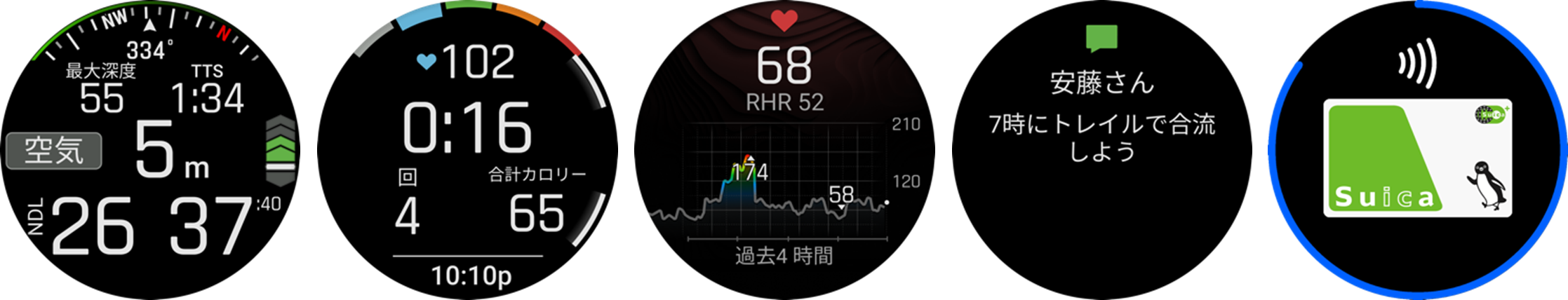 左から、ダイビング、筋トレ、心拍計、通知機能、Suica