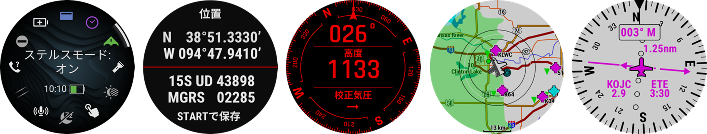 左から、ステルスモード、デュアルポジションフォーマット、レッドシフトモード、METAR&TAF気象レポート、直接ナビゲーション