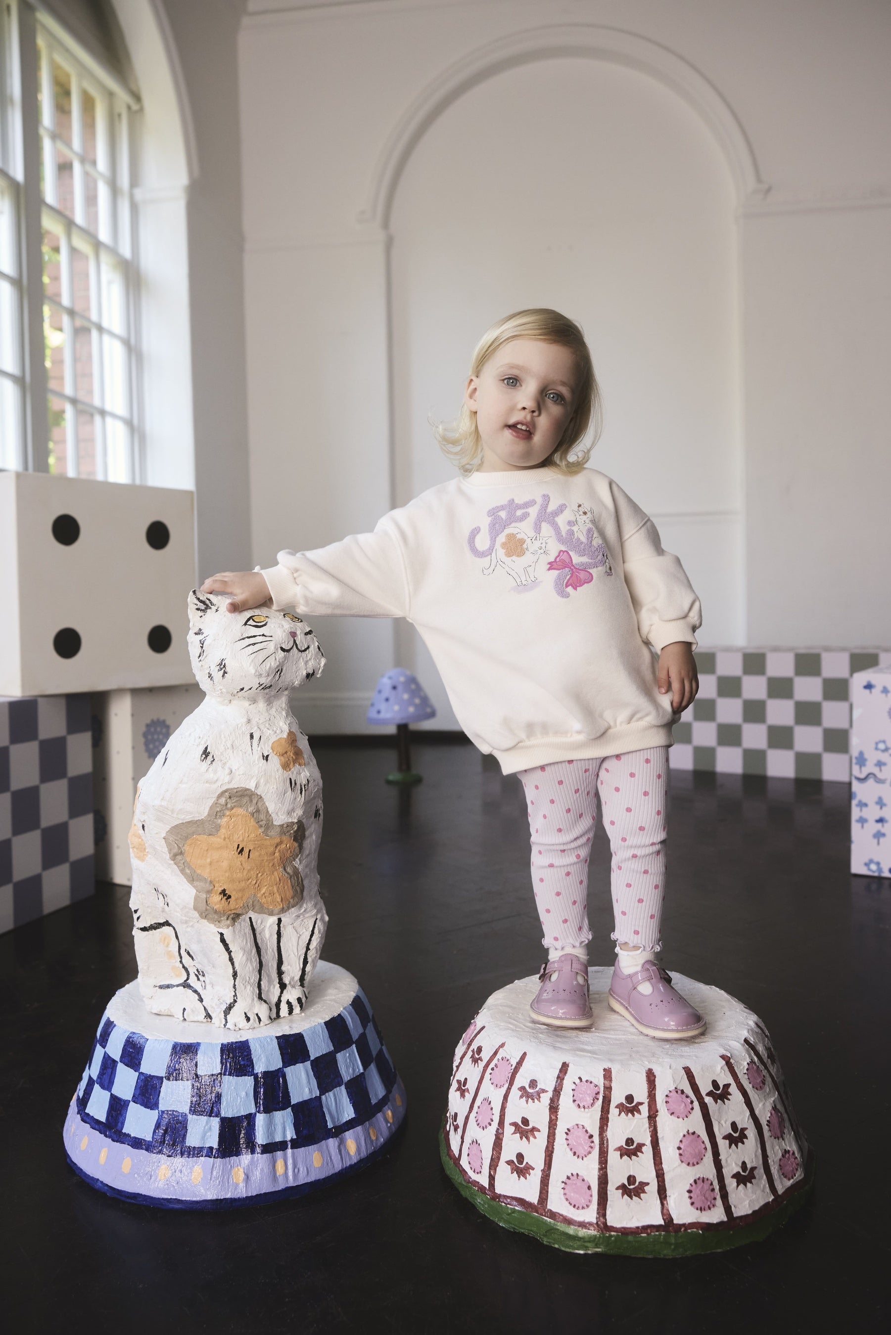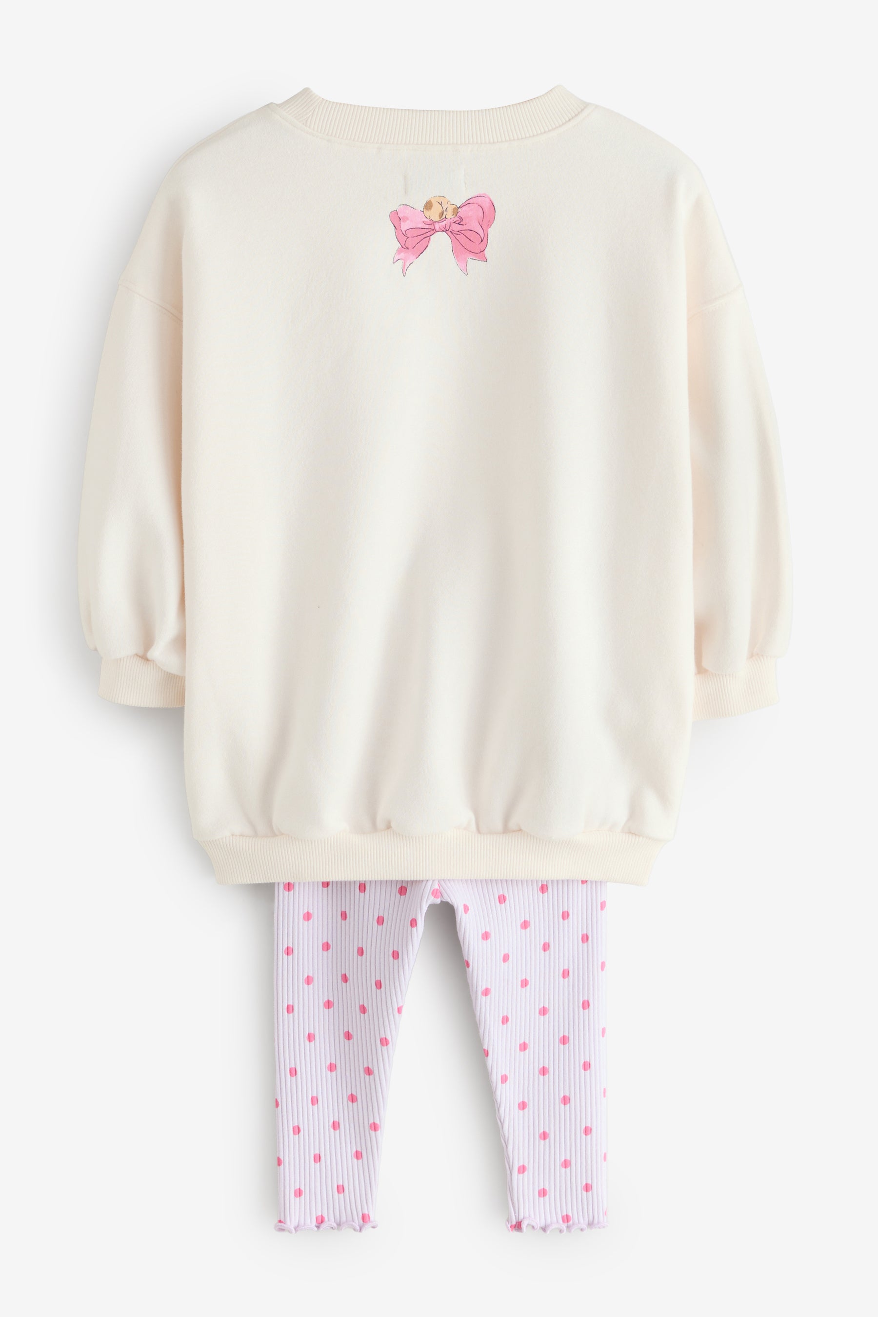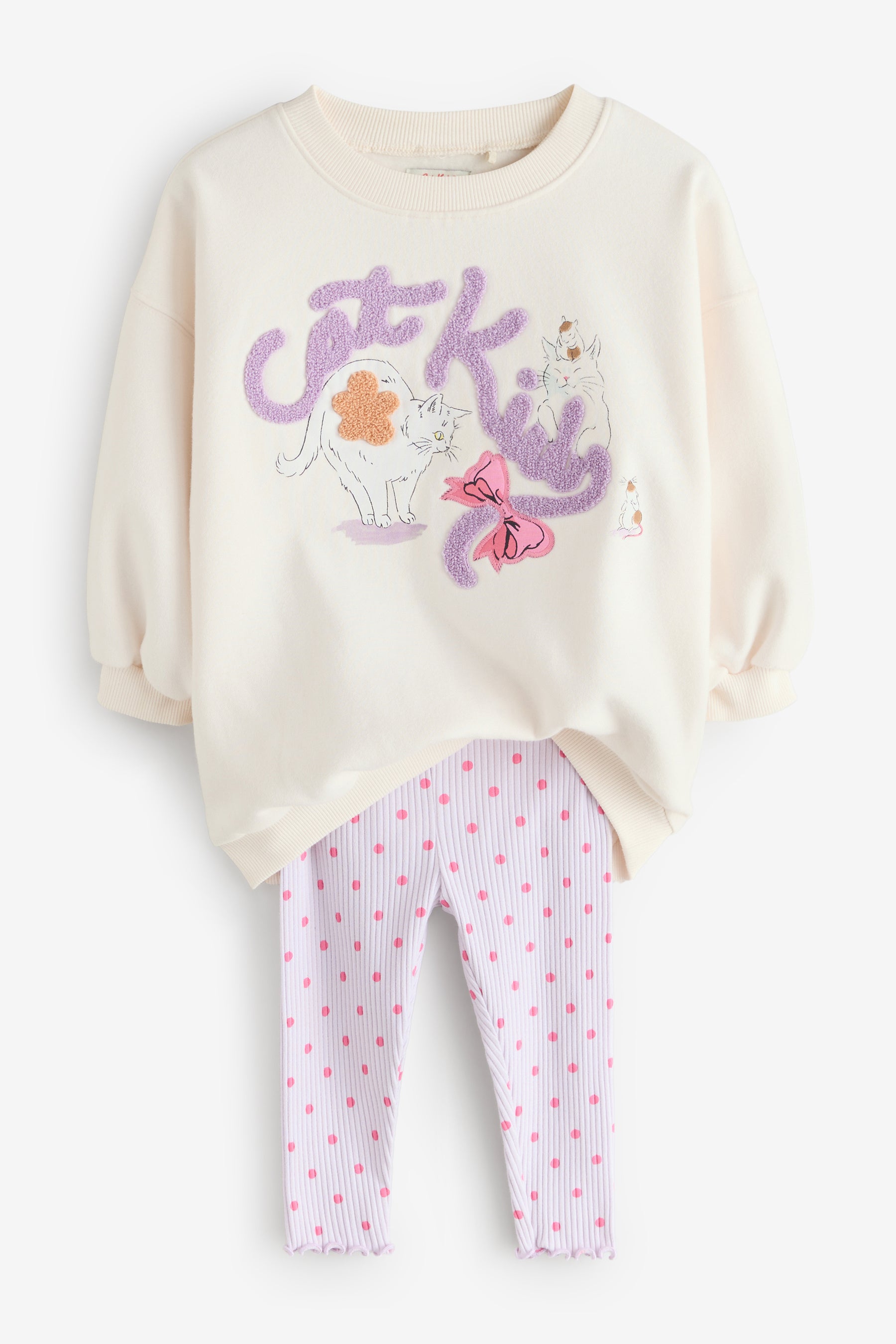 スウェット&レギンスセットはリラックスしたシーンにオススメの、花模様の猫が可愛らしいスウェットと水玉のレギンスのセット。一見Cath Kidstonのロゴの様に見えるモコモコとした文字は、よく見るとCat(猫)Kidsになっていて、遊び心たっぷり。背中にはリボンのワンポイントとその上で気持ちよさそうに丸まって眠る猫が描かれています。
