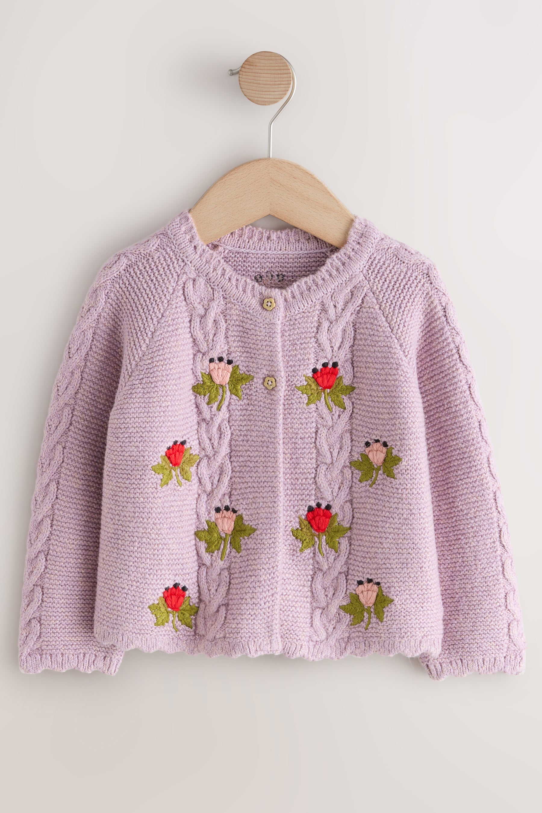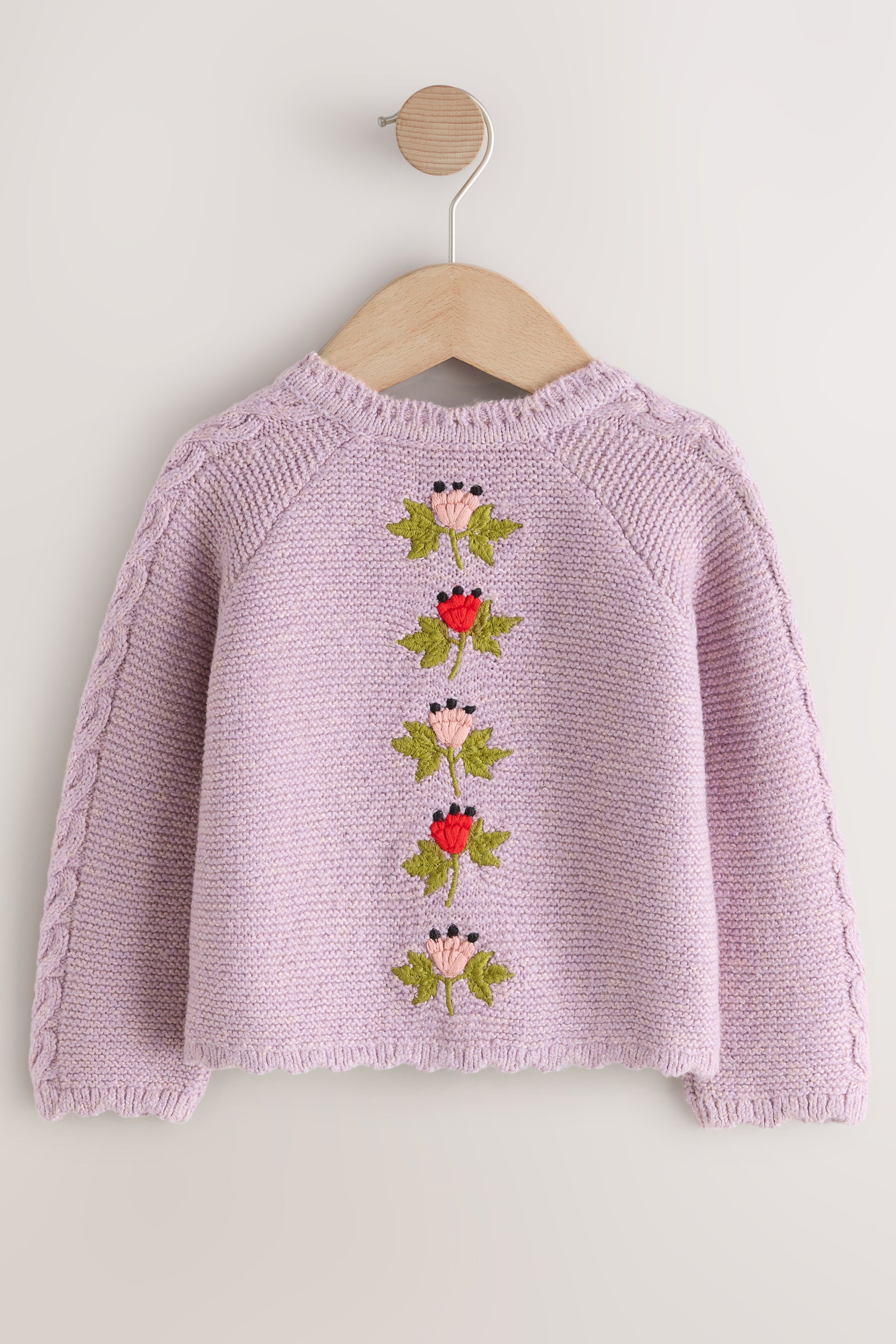 フローラルケーブルカーディガンは淡いパープルカラーがやさしい印象。刺繍のお花を散りばめており、背面にもお花が縦に並びます。後ろから見ても可愛いらしさが溢れる一着です。