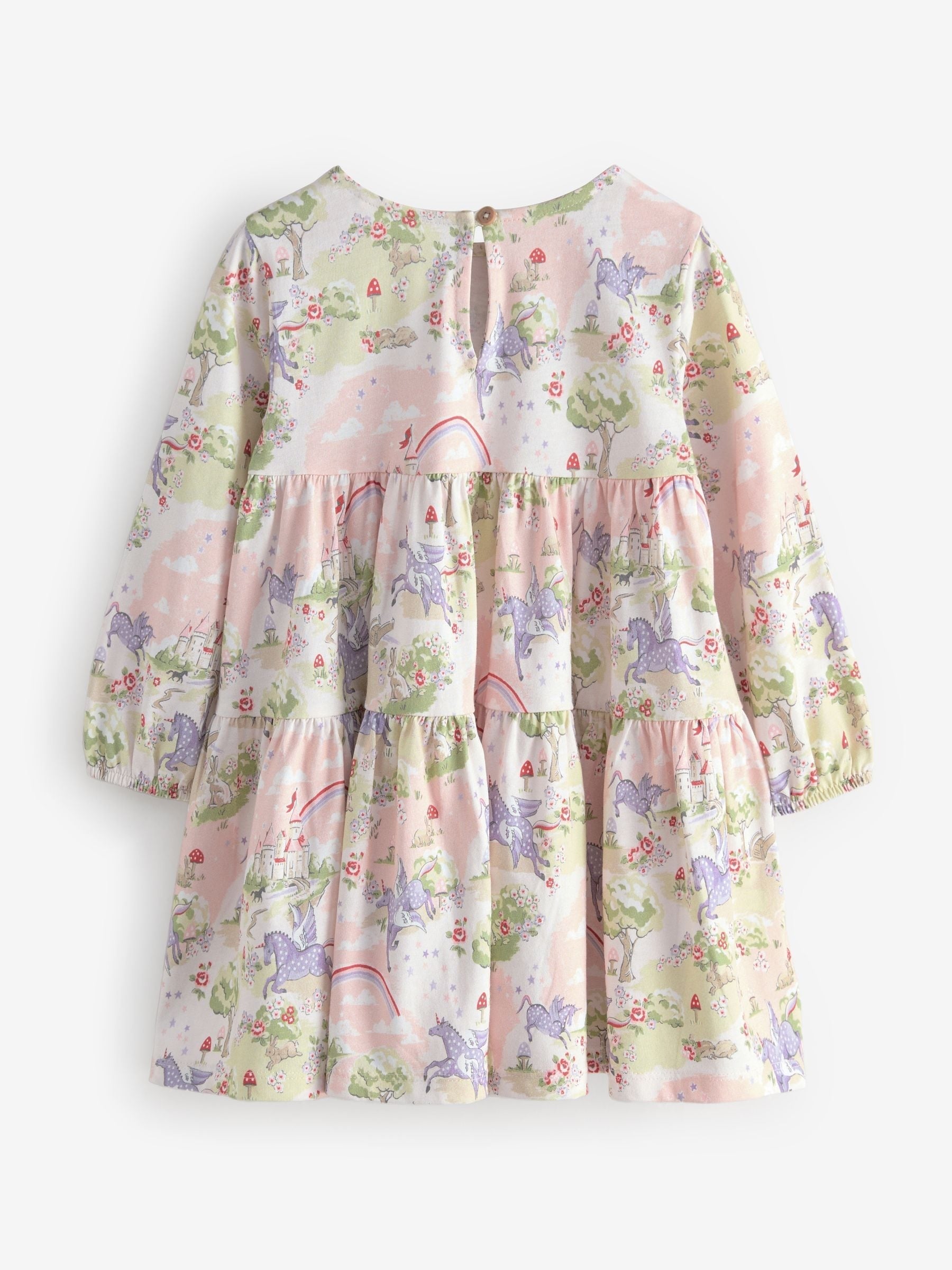 Pink Unicornのアートは、柔らかなコットン製の長袖ティアードドレスに仕立てました。気まぐれな妖精と魔法のユニコーンの住む世界を夢のような繊細なタッチで描いたプリントです。