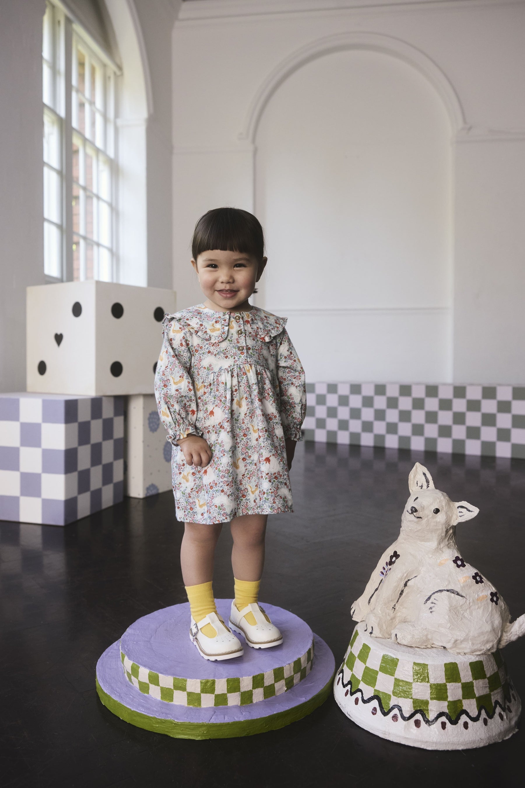 Ditsy Printのロングスリーブワンピースは、フリルのついた襟が可愛らしい、柔らかなコットン素材。淡い色で描かれた白クマと鹿たちがたくさんの花の中で思い思いに過ごしているアートです。
