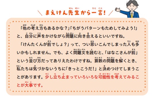 また、本書では、すべての問題に「まえけん先生からの一言」を掲載。この一問に限らない「考え方のコツ」を学べることが特徴です。ぜひ親子で、算数の新たな楽しさを発見してみてください。
