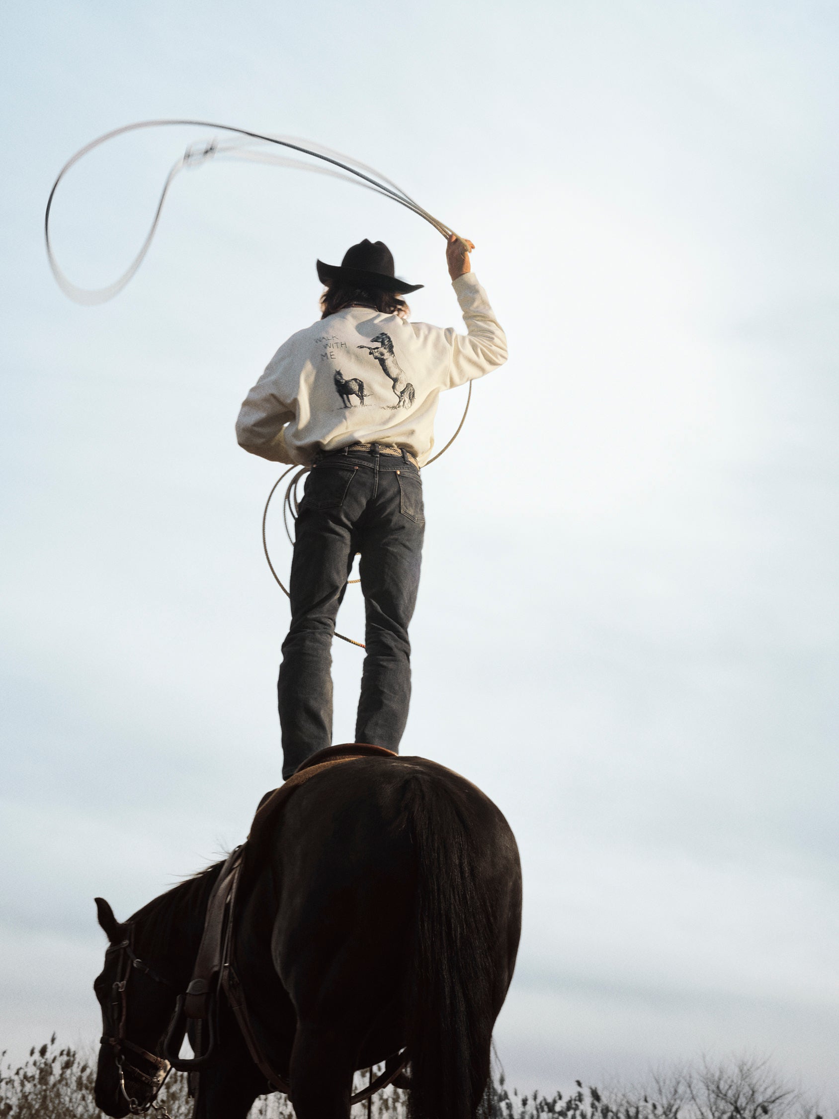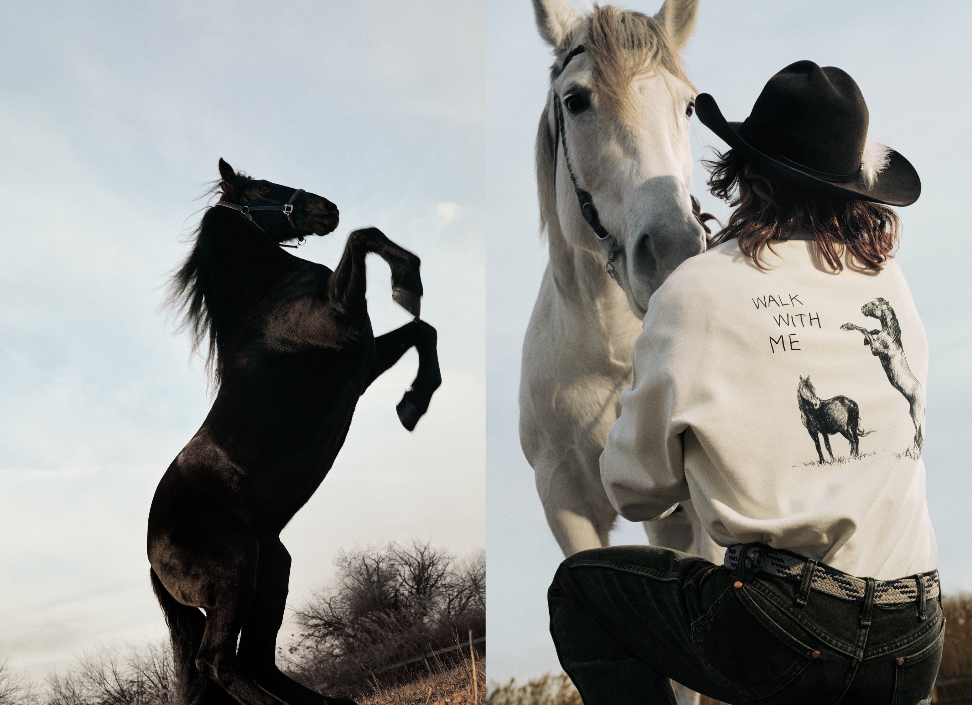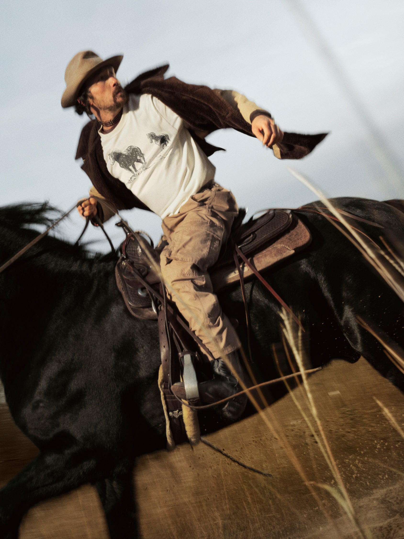 本コレクションでは、ロサンゼルスを拠点とするコンテンポラリーアーティスト、マット・マコーミックとのコラボレーションアイテムを、一部店舗限定で展開します。自然や野生馬を想起させるモチーフをさりげなく取り入れた彼の表現は、洗練されたビジュアルアプローチによって、ルナニューイヤーコレクションに文化的かつ芸術的な奥行きをもたらします。馬のフォルムやラインから着想を得たグラフィックは、ミニマルな構成の中に祝祭的な意味を宿し、コレクション全体のファッションストーリーと有機的に響き合います。