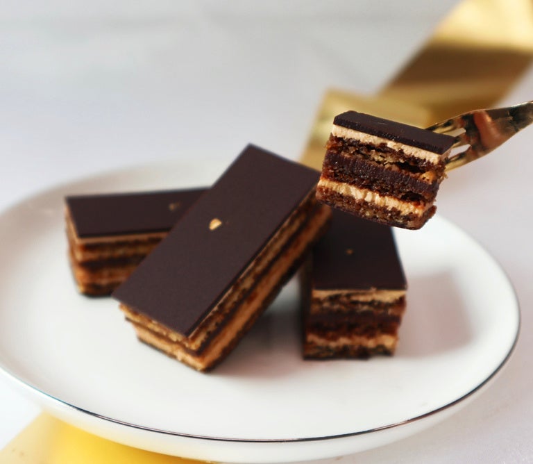 コーヒー風味のバタークリーム、ガナッシュ、ビスキュイ・ジョコンド、グラサージュ。7層からなる重厚な味わいをご堪能ください。食べやすいサイズに切り分けた「オペラ サンク」はギフトに最適です。