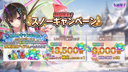 合同会社EXNOA(本社:東京都港区、CEO:東條 寛、URL:https://games.dmm.com/)が運営するDMM GAMESは、『転職魔王~リストラ勇者のお仕置きセレナーデ~』(以下、『転職魔王』)にてスノーキャンペーンを開始したことをお知らせいたします。本キャンペーンでは、合計10,900個の竜神石が手に入るログインボーナスを実施するほか、新たなスキルを持つ新キャラクター「風巻しぐれ」が登場いたします。