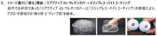 さらに、「リアクティブ iQ・ウレタンカバー」と「スリップレス・バイトコーティング」を継続採用することで、タイガー・ウッズをはじめ、多くのプロが認めるアプローチショットでのフェースへの“乗り感”と“ディープ感”でイメージ通りに「寄る」性能を追求しています。加えて、カバーの傷がつきにくく耐久性が高い点も、契約プロから高い評価を得ています。