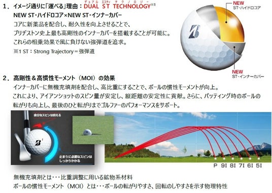 今回進化したのは、新薬品を配合した「ST・ハイドロコア」とブリヂストンゴルフ史上最も高剛性の「ST・インナーカバー」で、これらの相乗効果により、風に強く、狙ったラインへ安定して「運べる」強弾道を追求しています。また、比重の高いインナーカバーがボール全体の慣性モーメント(MOI)を高めることで、空中でのスピン量が安定し、飛距離と弾道の安定性を高めるとともに、グリーン上でのパッティング時の転がりの良さも追求しています。