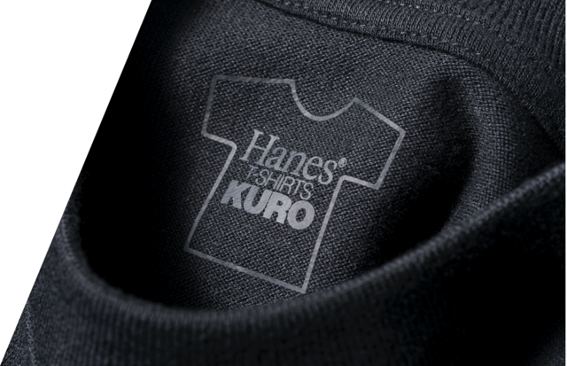 Hanes KUROの最大の特徴は、独自製法による「先染めBLACK」です。通常の後染めと違い、生地になる前段階の糸の状態で染色することで、繊維の奥まで色が浸透。