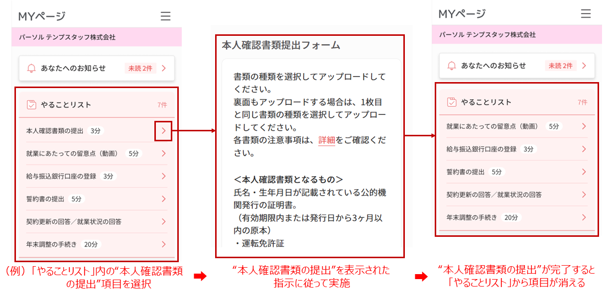 必要な方に必要なタイミングで、トップページに「やることリスト」を表示。登録時や就業開始時に必要な手続きや提出物、就業中の更新確認や年末調整など、必須の対応事項が一目瞭然で分かるため、スムーズに取りかかることができます。さらに項目によっては所要時間が表示される点も、自分の都合に合わせながら、作業が効率的に進められるポイントとなります。また1日1回のメール・アプリ通知は、重要なお知らせの見落とし防止にも役立ちます。
