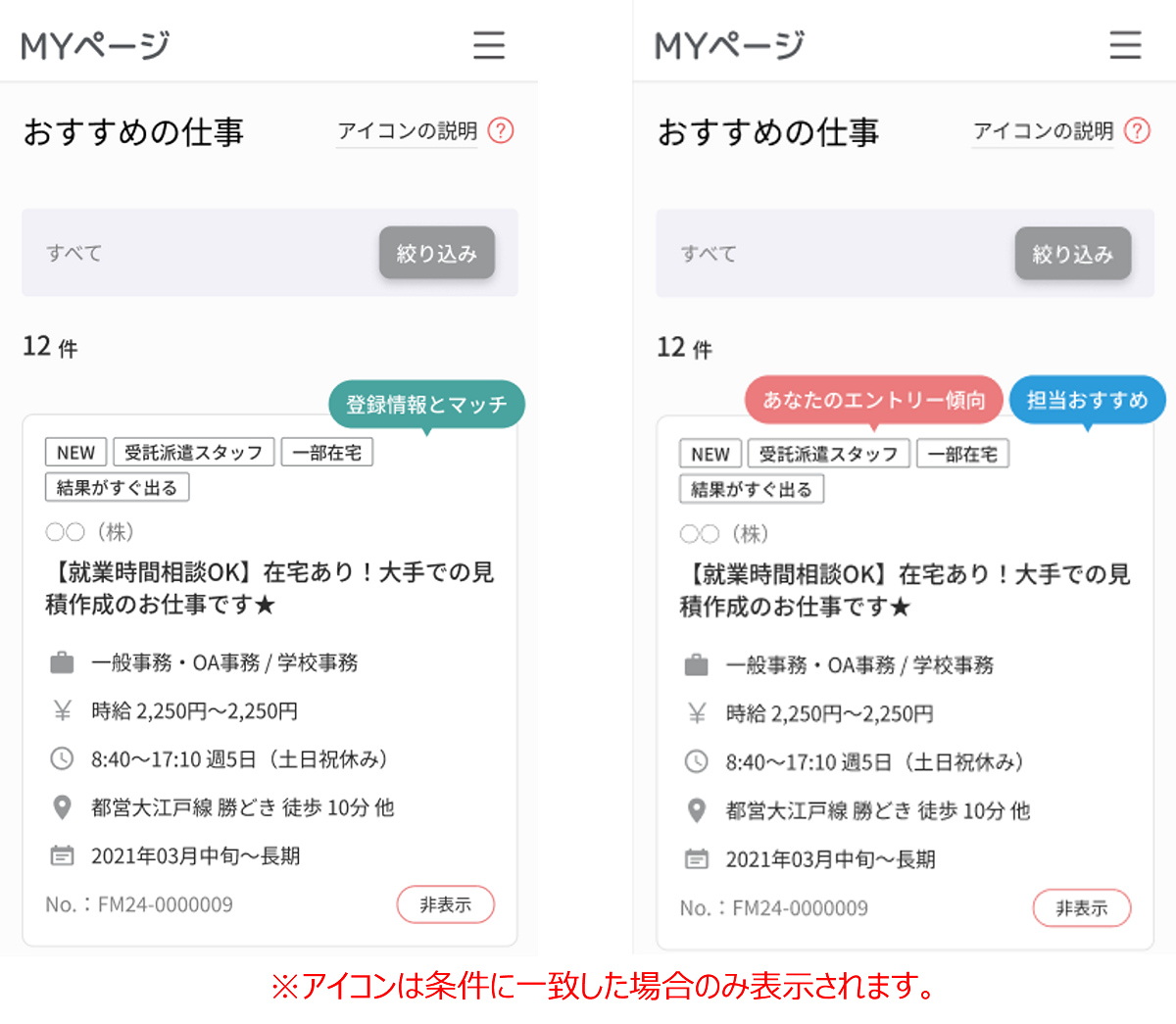 希望条件や経験、スキルにマッチするおすすめの仕事が表示されるため、自分に合った仕事をさらに見つけやすくなりました。絞り込み機能や吹き出しアイコン表示などの機能も備わり、利便性が向上しました。
