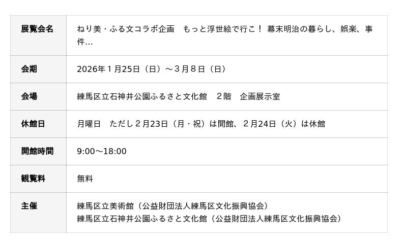 練馬区立美術館(ねり美)と練馬区立石神井公園ふるさと文化館(ふる文)はいずれも区立のミュージアムですが、収蔵品や展覧会の性格の違いから、これまで、共同企画を開催することはありませんでした。
