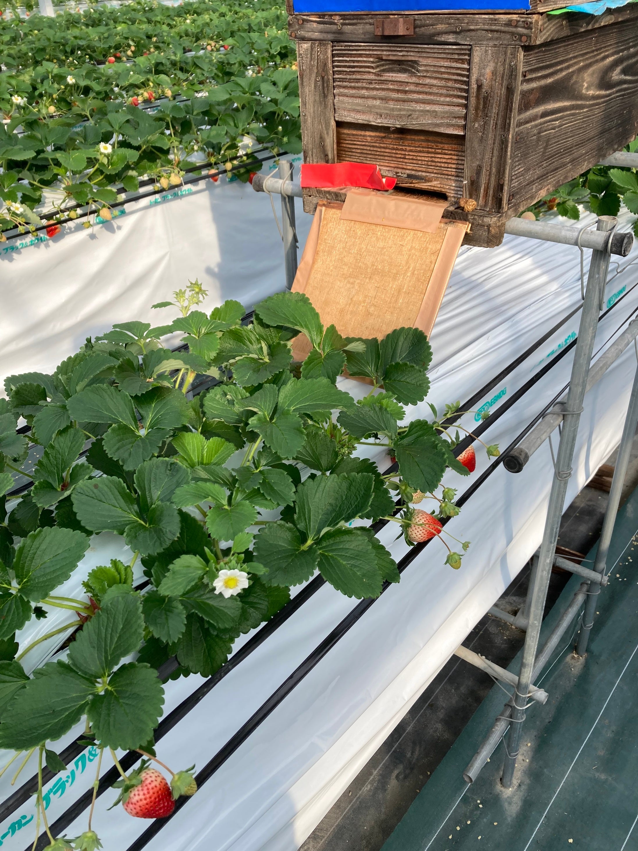 イチゴハウス内にあるミツバチの巣箱