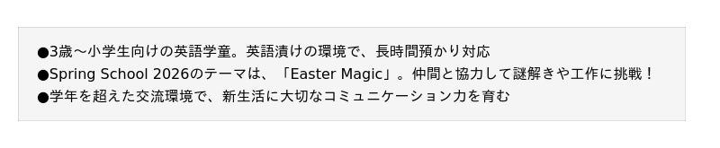 そのような中、Kids DuoのSpring Schoolは、英語環境での長時間保育を提供することで、こうした不安を解消します。新1年生(現年長児)には小学校生活同様の親元を離れた時間に慣れるためのプレ期間として、また在校生には規則正しい生活の中で英語に親しむ有意義な休暇として活用いただき、自信を持って新年度を迎えられるようサポートいたします。