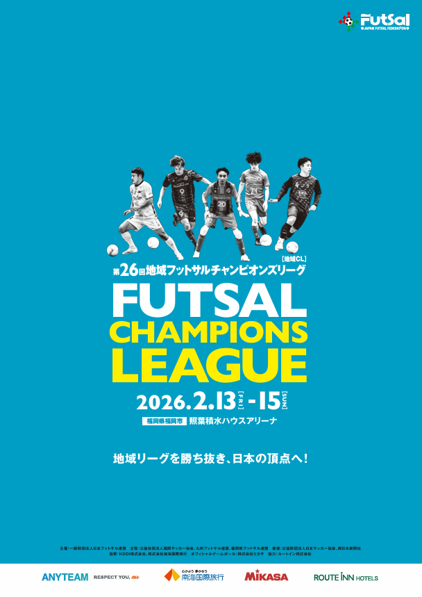 第26回地域フットサルチャンピオンズリーグを2026年2月13日(金)~15日(日)の3日間、福岡県福岡市の照葉積水ハウスアリーナにて開催いたします。