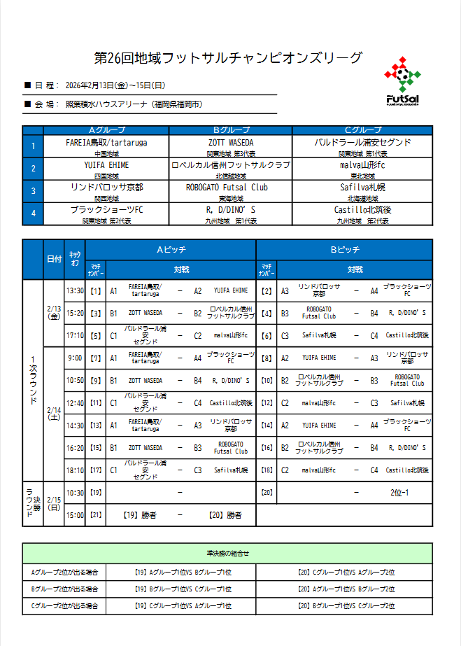 本大会に出場する各地域代表12チームの組合せおよびスケジュールが決定いたしましたのでお知らせいたします。
