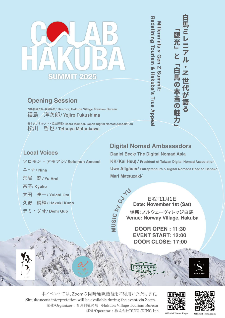 本イベントは、観光庁の 「令和7年度 デジタルノマド誘客に向けたモデル実証事業」 に採択された取り組みであり、世界中から集うデジタルノマドと地域住民・若者世代が、白馬の未来を語り、共につくり上げる“共創型サミット” として開催されました。