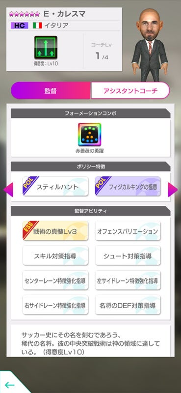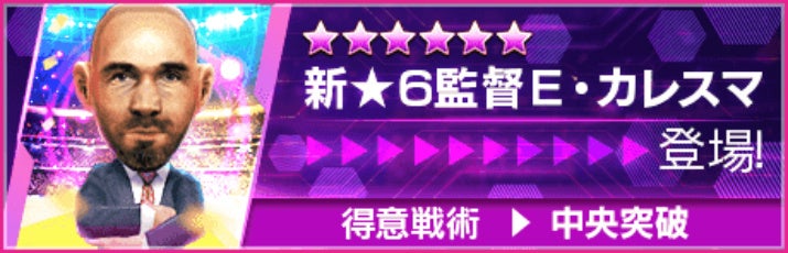 該当の選手を編成すると強くなるフォーメーションコンボ「赤薔薇の勇躍」と戦術得意度Lv10を持つ新★6監督「E・カレスマ」が登場します。