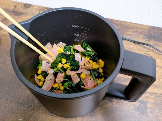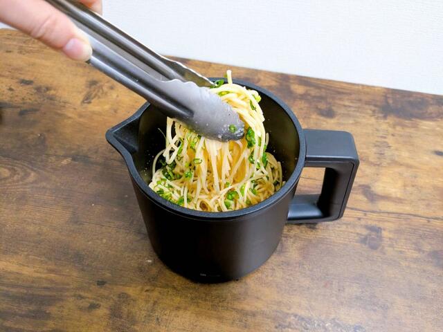 内側にコーティングが施されているおかげで、茹でるだけでなく「和える」調理までスムーズにできるようになっています。コンロを使わず、コンパクトなポットで完結しちゃうのが便利過ぎますね。