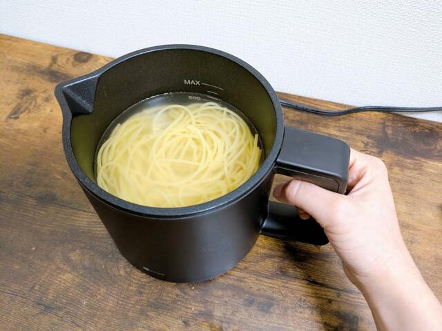 まず、1人分のパスタをつくってみます! 約600mLの水を入れ、スイッチ「強」で加熱すること約7分。