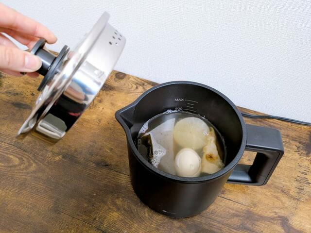 煮る&温める機能は「1台3役の電気ケトルポット」のときから引き続き搭載されています。市販の1人用調理済みおでんをドバーっと入れて、スイッチ「強」でコトコト煮込んだら約4分でアツアツに。